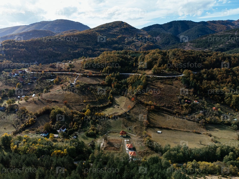 Вид с воздуха на горы Тара в Сербии с осенним лесом, сельской долиной и утренним туманом