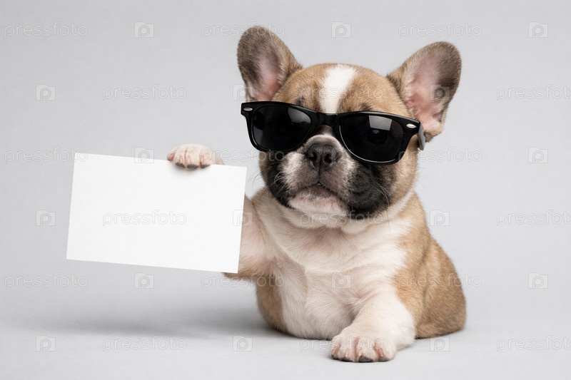 Щенок французского бульдога в черных солнцезащитных очках держит пустую белую карточку на светлом фоне — студийный портрет для рекламы, мокапа и шаблона для текста