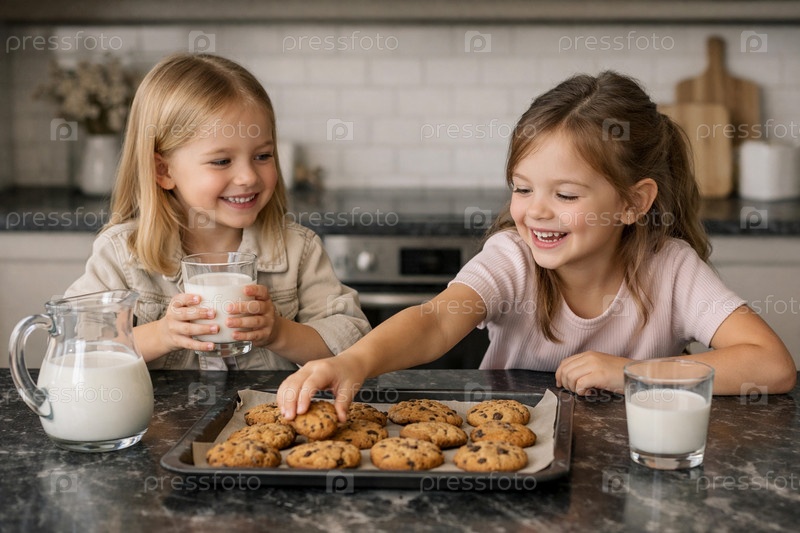 Две девочки в уютной домашней кухне берут свежеиспеченное печенье с шоколадной крошкой с противня и пьют молоко