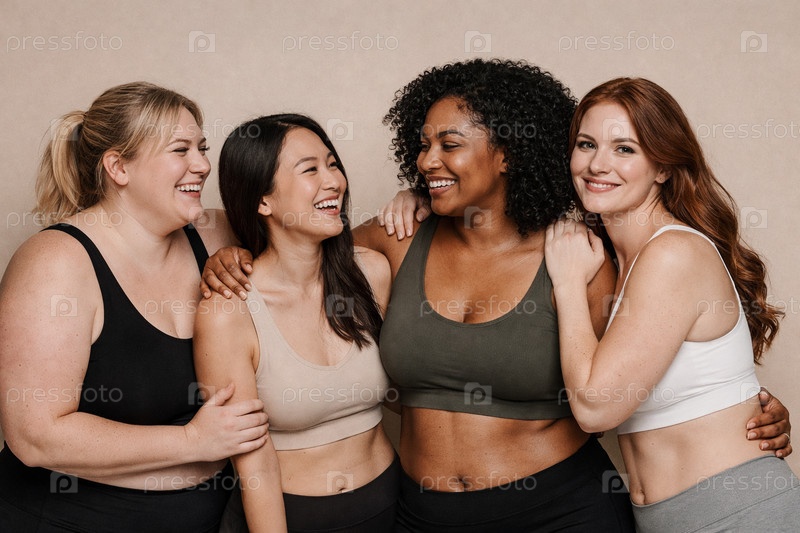 Четыре женщины разной национальности и с разным телосложением в топах и нижнем белье обнимаются и улыбаются на нейтральном фоне — концепция бодипозитива, принятия тела и женской поддержки