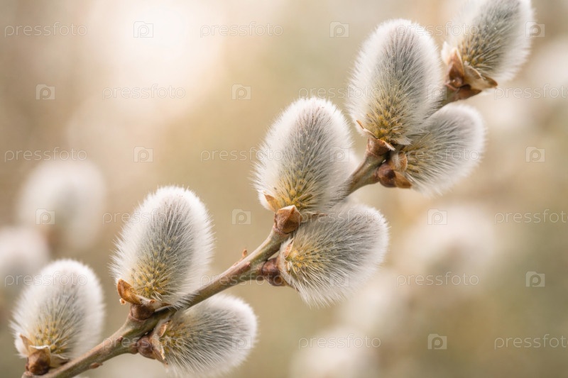Крупный план пушистых вербовых сережек на ветке весной — макрофотография нежных серебристо‑серых почек на мягком размытом фоне