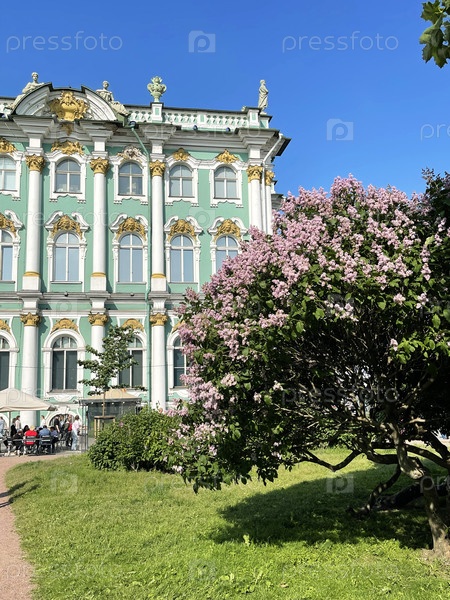 14 июня 2025 года - Санкт-Петербург, Россия: Цветение лилии на фоне стены Зимнего дворца в солнечный весенний день
