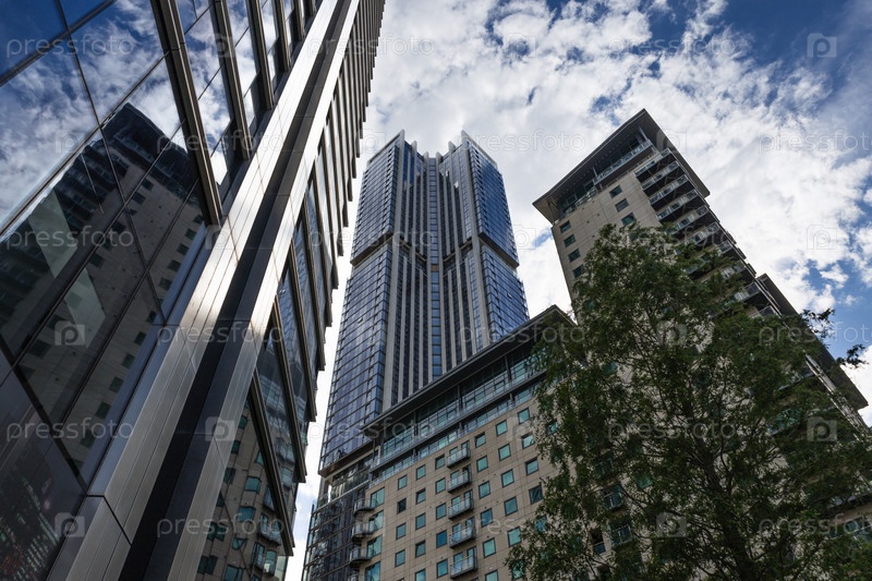 Низкий угол обзора возвышающихся современных небоскребов и жилых зданий на фоне яркого синего неба с мягкими белыми облаками