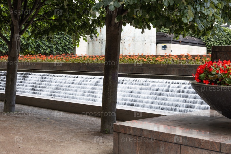 Расслабляющий городской пейзаж на открытом воздухе с современным многоуровневым фонтаном, рядами красных цветов и лиственных деревьев, обеспечивающих тень на общественной площади
