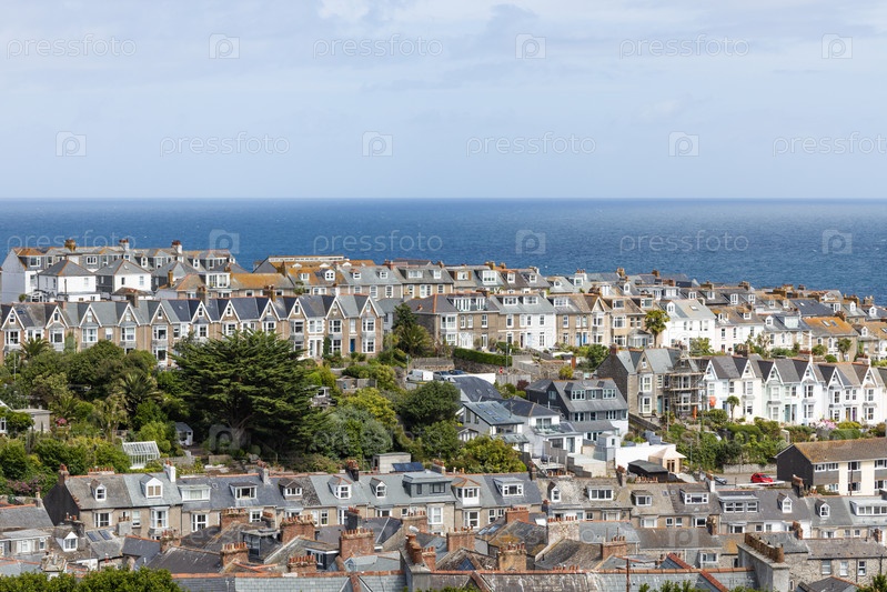 Широкий воздушный вид традиционных домов и крыш в приморском городе Сент-Ивс, Корнуолл, под голубым небом с океаническим горизонтом на заднем плане