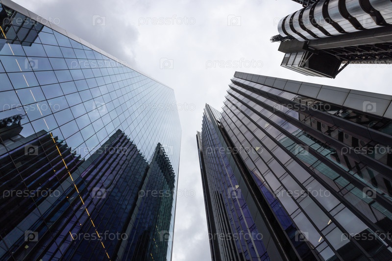 Низкоугольный вид на современные стеклянные небоскребы против облачного неба в оживленном финансовом районе