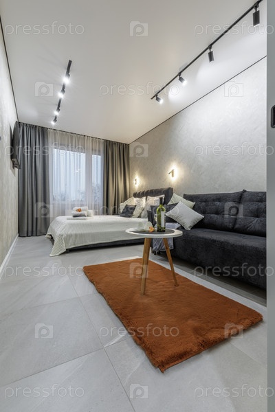 Широкий интерьер современной квартиры-студии.В комнате есть темный диван, белая текстура кровать и минималистский круглый стол с вином.Большие окна с серыми шторами и стильное освещение дорожки улучшают просторную яркую атмосферу