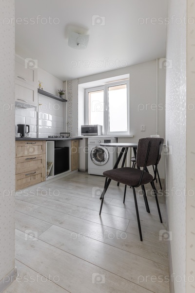 Функциональная небольшая кухня со светлыми деревянными шкафами, черной столешницей и интегрированными приборами.Пространство включает в себя компактный обеденный стол с темными стульями, стиральную машину под окном и ярко белые плитки на задней панели