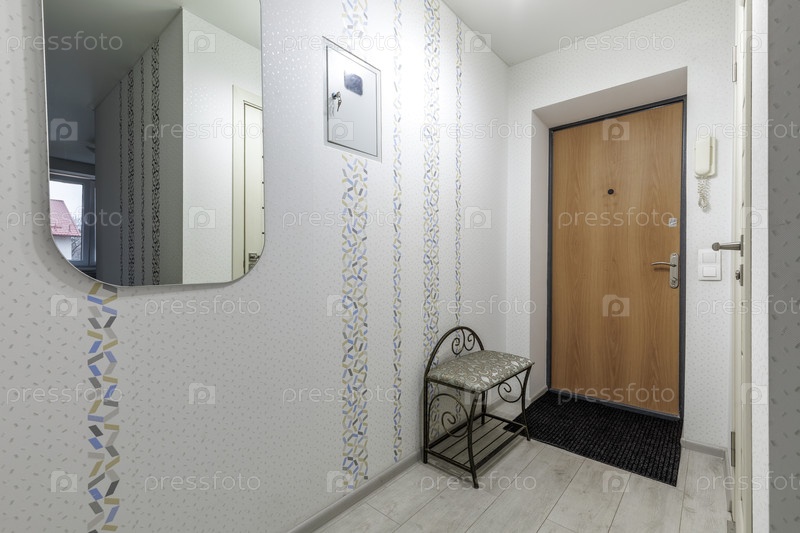 Внутренний вид уютного подъезда с легкой деревянной входной дверью, декоративной металлической скамейкой и большим настенным зеркалом, отражающим окно