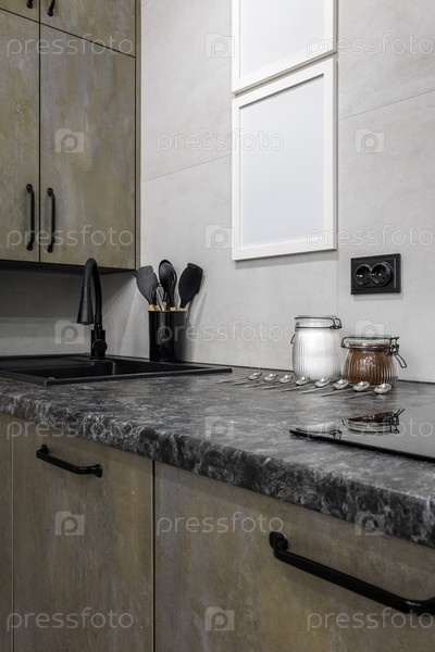 Близкий план современного кухонного стола с оливково-серыми каменными шкафами и темной гранитной поверхностью.Сцена включает в себя черную раковину, кухонные принадлежности, стеклянные банки с припасами и две пустые белые рамки на серой стене