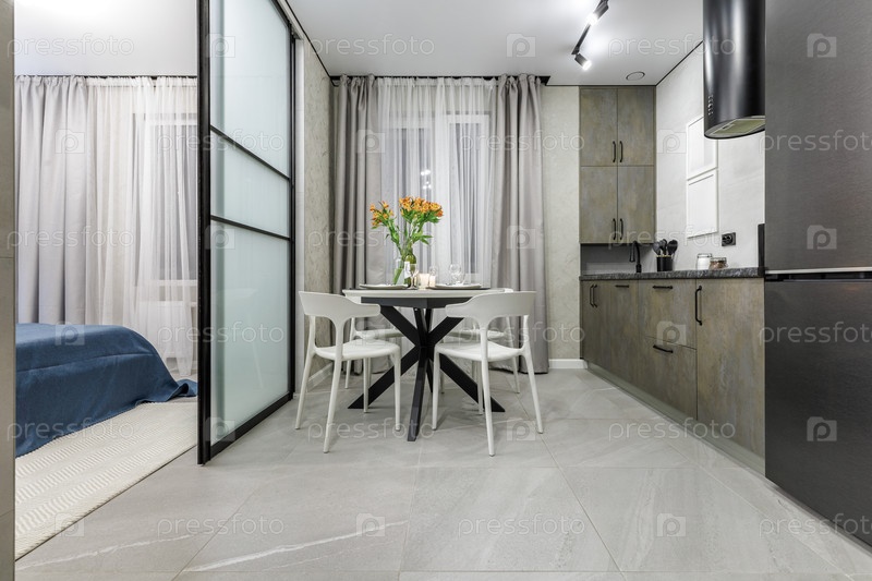 Стильная современная квартира-студия с открытой кухней со шрифтами из серого камня, круглым обеденным столом с белыми стульями и стеклянной перегородкой, ведущей в спальню с голубыми постельными принадлежностями