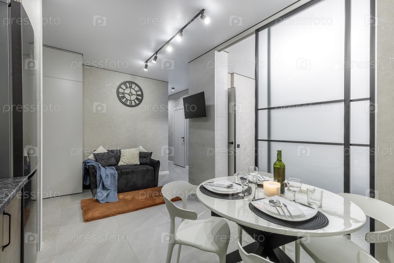Просторная современная квартира-студия с круглым белым обеденным столом с четырьмя стульями, гладкой серой кухней и гостиной с профессиональным освещением трассы и стильным декором
