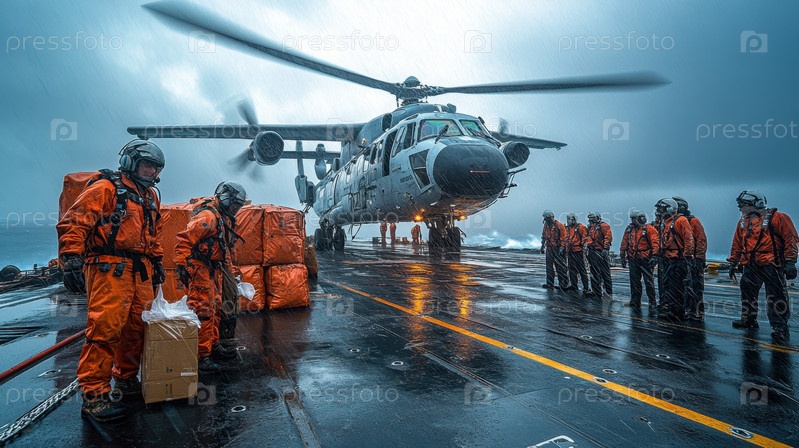 Военный вертолет приземляется на палубе авианосца под сильным дождем, окруженный членами экипажа в оранжевом оборудовании для перевозки грузов
