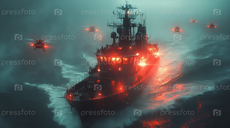 Тяжело вооруженный военный боевой корабль перемещается по бурным водам ночью, освещенный красными предупреждающими огнями, а ударные вертолеты летают вблизи
