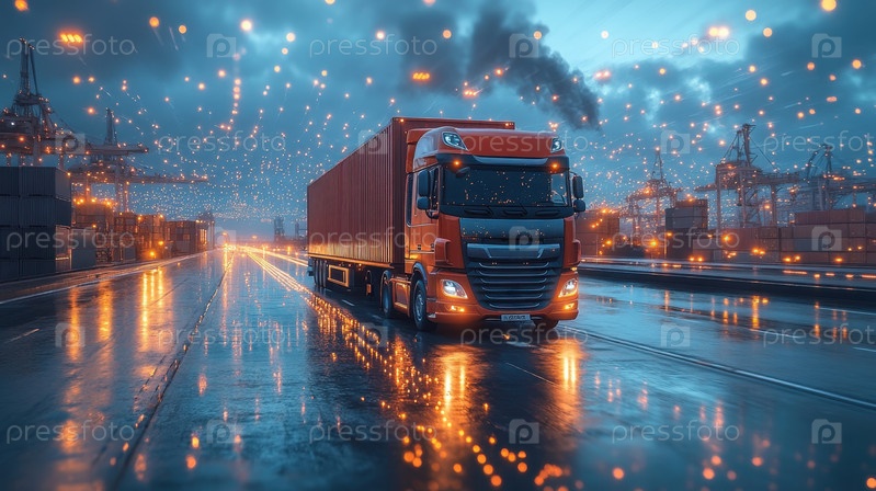 Футуристический грузовик в высокотехнологичном логистическом порту