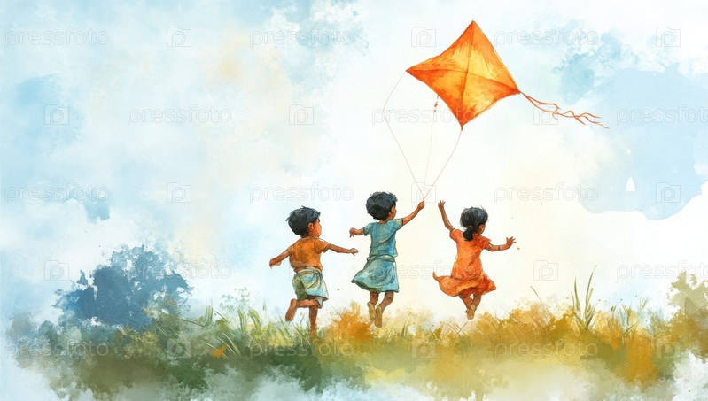 Счастливые дети летают с воздушным змеем в стиле акварель