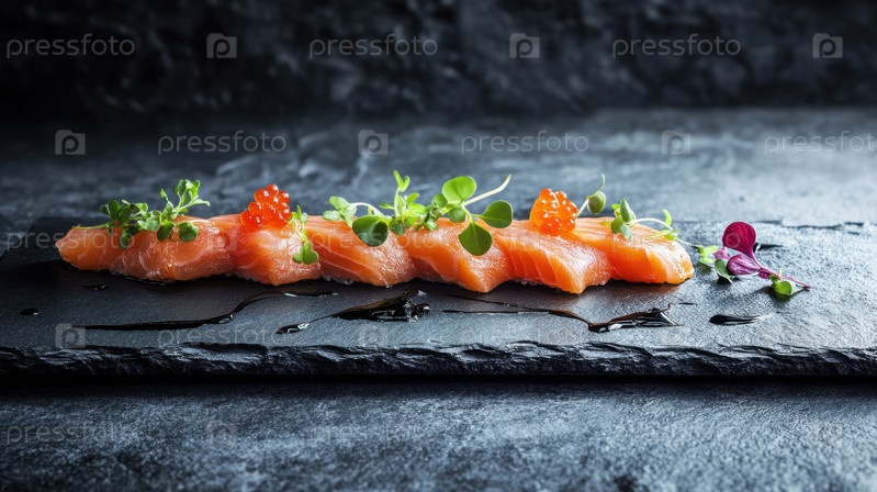 Элегантные лососевые рулоны суши с микрозеленками на черном сланце