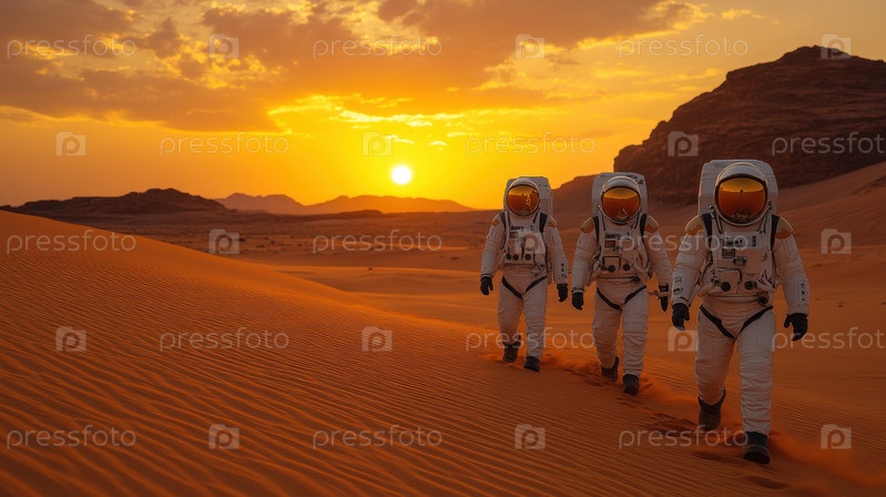 Астронавты, гуляющие по пустыне на закате