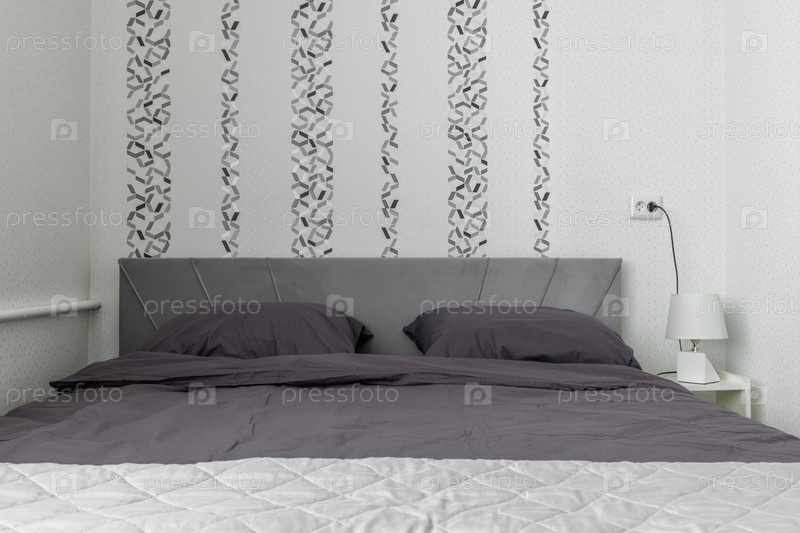 Ближайший снимок современной спальной зоны с серой мягкой головкой, темным постельным бельем и белым ночным столом со лампой.Стена украшена характерными вертикальными обоями