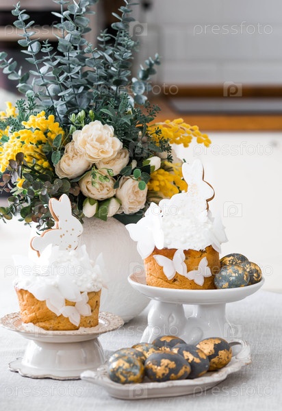 Счастливая Пасха 2026. пасхальный торт с белым кроликом и бабочками, пасхальные яйца со золотом, свечи и весенний букет цветов на столе. стильная пасхальная натюрморт