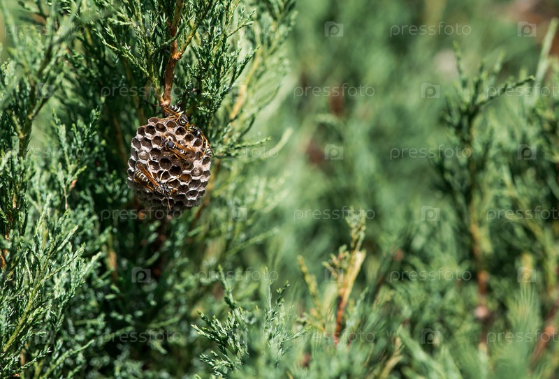 Осы, сидящие на медовом гнезде в ближайшем кадре.Осы на гнезде, расположенном на ветке березового дерева