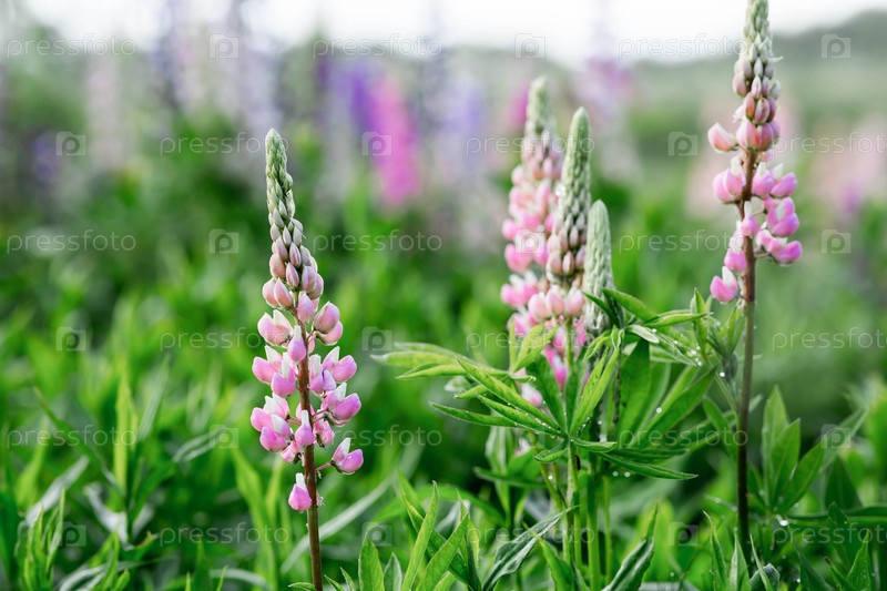 Цветящий люпин (Lupinus polyphyllus).Цветущие полевые крупнолистные или садовые люпины в начале лета, ближайший снимок с выборочным фокусом