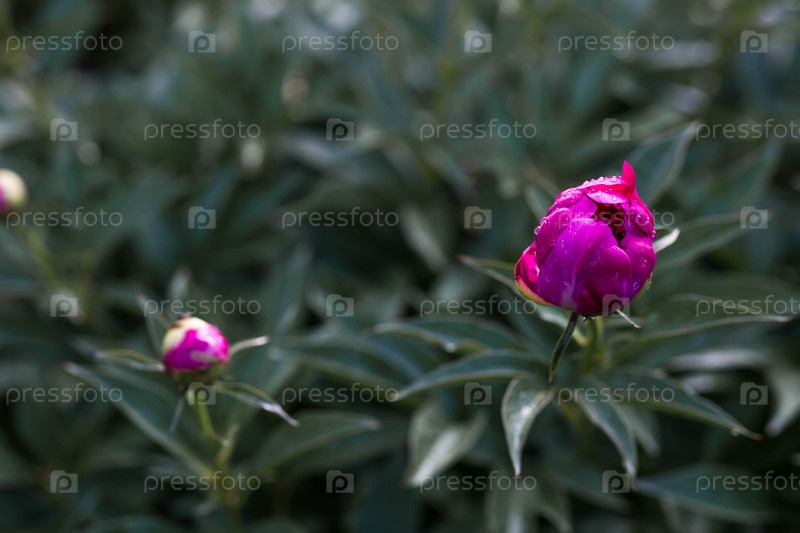 Близкий план цветущего розового пиона. Цветок и бутоны в капельках дождя. Зеленый природный фон. Цветящий сад. Красивый бокех