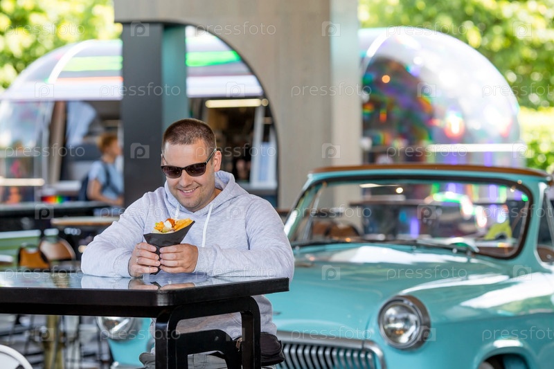 Быстрая уличная еда и образ жизни.Молодой человек в ресторане быстрого питания на свежем воздухе съедает вредные вкусные гироскопы.Мужчина улыбается и счастлив