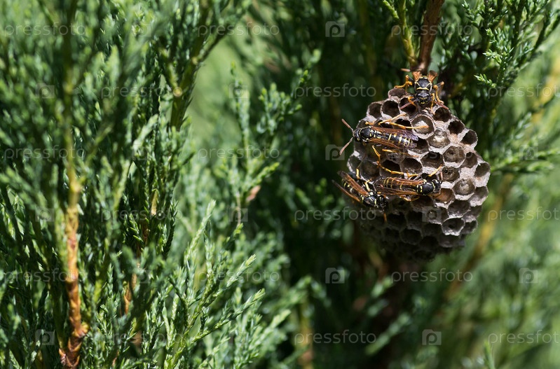 Осы, сидящие на медовом гнезде в ближайшем кадре.Осы на гнезде, расположенном на ветке березового дерева