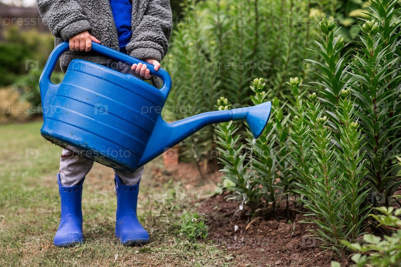 Концепция садоводства, содержания сада и обучения ребенка работе.Мальчик с голубой баночкой поливает растения и цветы в летнем саду на открытом воздухе