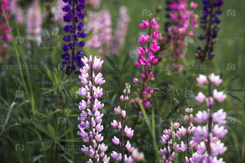 Цветящий люпин (Lupinus polyphyllus).Цветущие полевые крупнолистные или садовые люпины в начале лета, ближайший снимок с выборочным фокусом