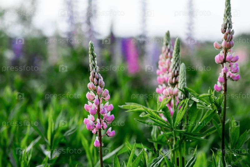 Цветящий люпин (Lupinus polyphyllus).Цветущие полевые крупнолистные или садовые люпины в начале лета, ближайший снимок с выборочным фокусом