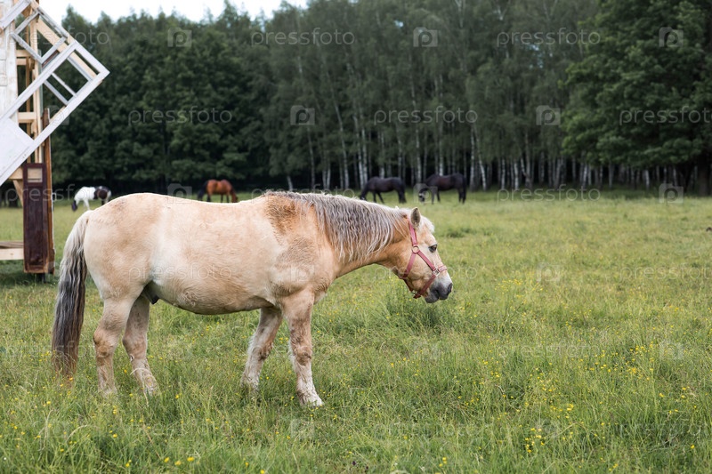 Красивые лошади на пастбище. Лошади в лужайке. Животноводство. Прекрасный природный пейзаж