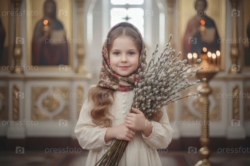 Религия и вера. Пальмовое воскресенье. Портрет маленькой девочки в русском народном плато с букетом верби внутри церкви