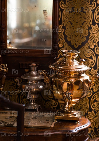 Древние, красивые самовары в Музее Самовара Дом туристского музея и сувенирный магазин Россия, город Коломна