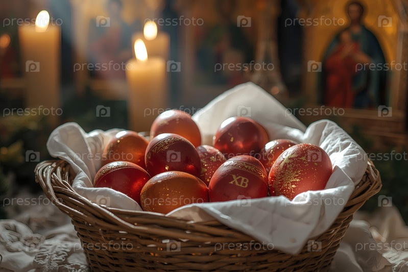 Православный Пасхальный праздник - это пасхальные яйца в корзине из уксуса, иконы, лица святых, цветы, церковные свечи и пасхальное украшение на деревянном столе в старом деревенском доме