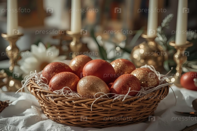 Православный Пасхальный праздник - это пасхальные яйца в корзине из уксуса, иконы, лица святых, цветы, церковные свечи и пасхальное украшение на деревянном столе в старом деревенском доме