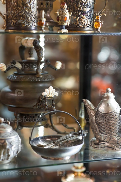 Древние, красивые самовары в Музее Самовара Дом туристского музея и сувенирный магазин Россия, город Коломна