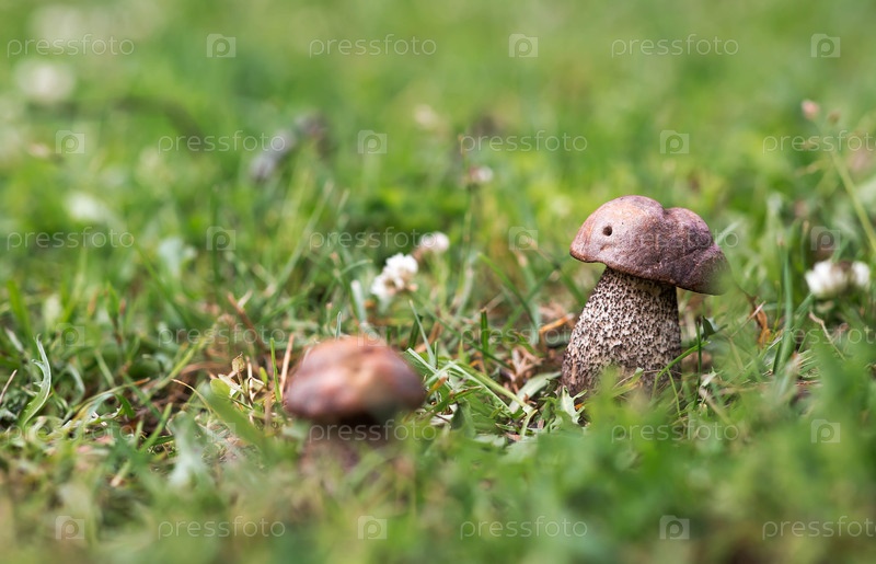 Близкий снимок гриба Léccinum scábrum на лесной равнине