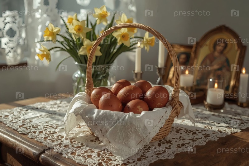 Православный Пасхальный праздник - это пасхальные яйца в корзине из уксуса, иконы, лица святых, цветы, церковные свечи и пасхальное украшение на деревянном столе в старом деревенском доме