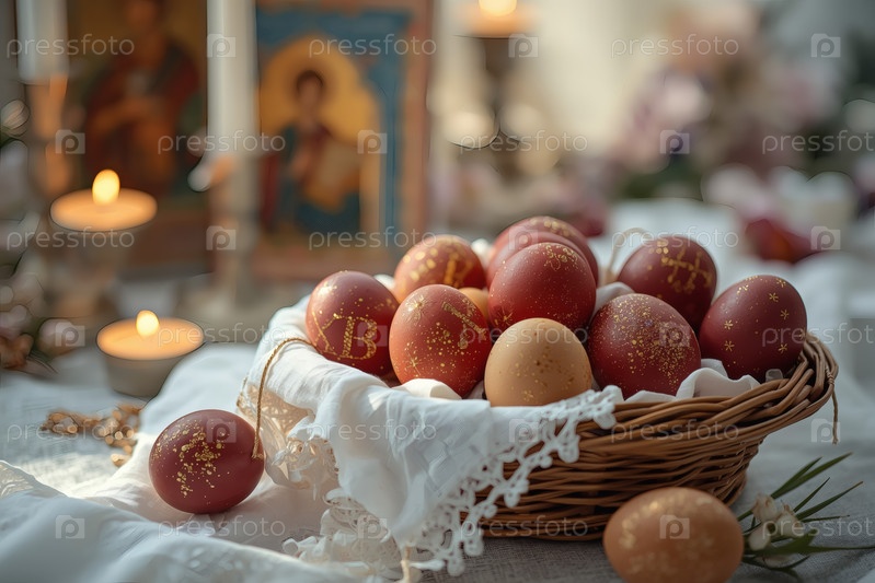 Православный Пасхальный праздник - это пасхальные яйца в корзине из уксуса, иконы, лица святых, цветы, церковные свечи и пасхальное украшение на деревянном столе в старом деревенском доме