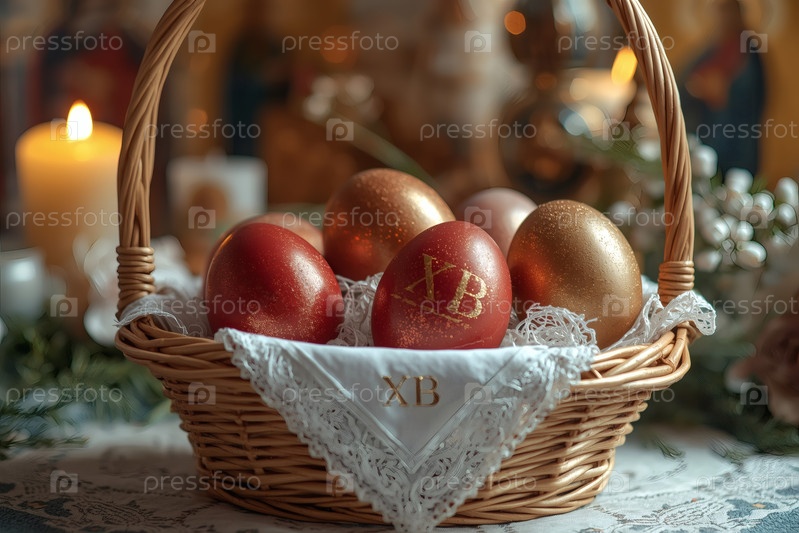 Православный Пасхальный праздник - это пасхальные яйца в корзине из уксуса, иконы, лица святых, цветы, церковные свечи и пасхальное украшение на деревянном столе в старом деревенском доме