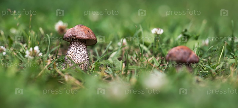 Близкий снимок гриба Léccinum scábrum на лесной равнине