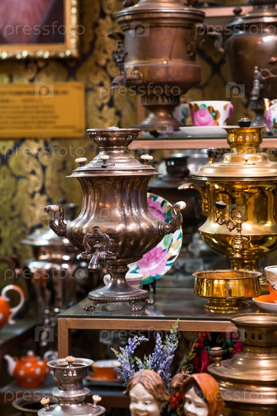 Древние, красивые самовары в Музее Самовара Дом туристского музея и сувенирный магазин Россия, город Коломна