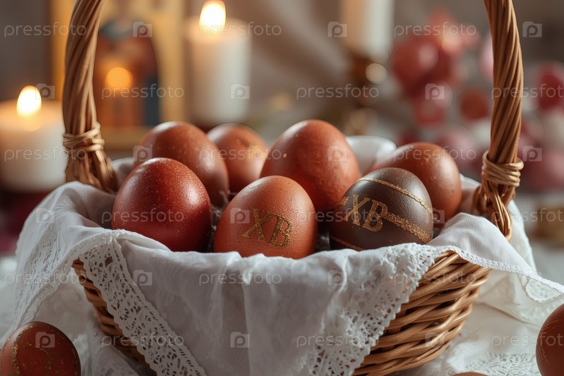 Православный Пасхальный праздник - это пасхальные яйца в корзине из уксуса, иконы, лица святых, цветы, церковные свечи и пасхальное украшение на деревянном столе в старом деревенском доме