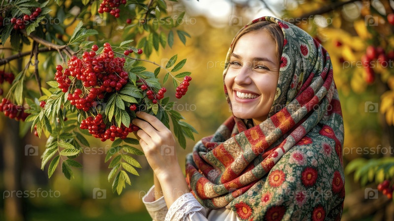 Веселая женщина со скарлетными ягодами в своем саду
