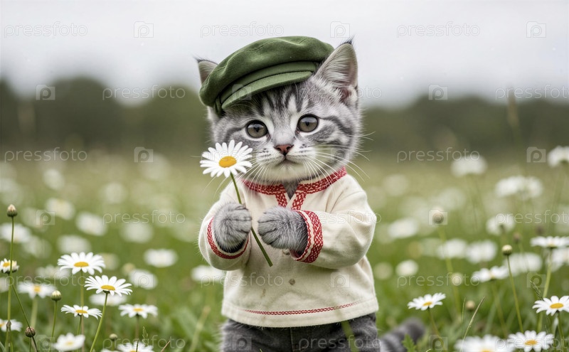Милый котенок в картузе и косоворотке с ромашкой