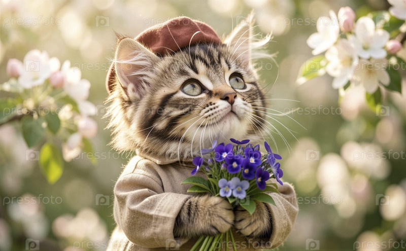 Кошка в берете держит букет цветов А
