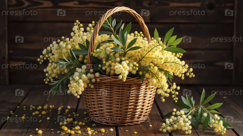 Корзина цветущих желтых цветов с зелеными листьями на деревянной поверхности
