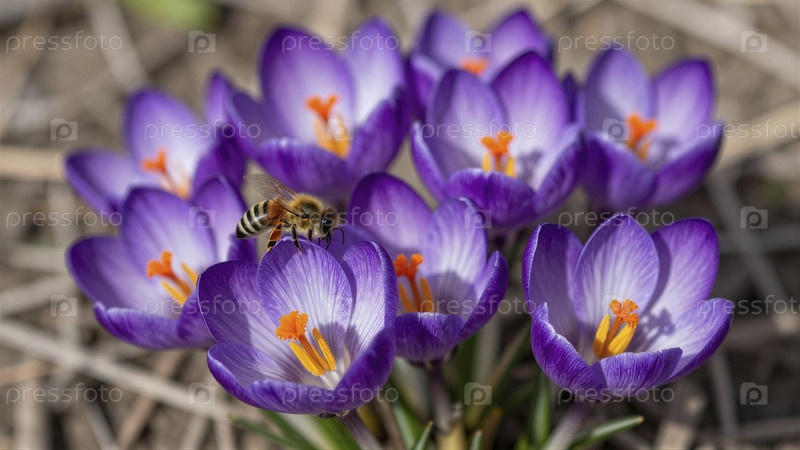 Медоносная пчела опыляет ярко-фиолетовые крокусы в солнечный день